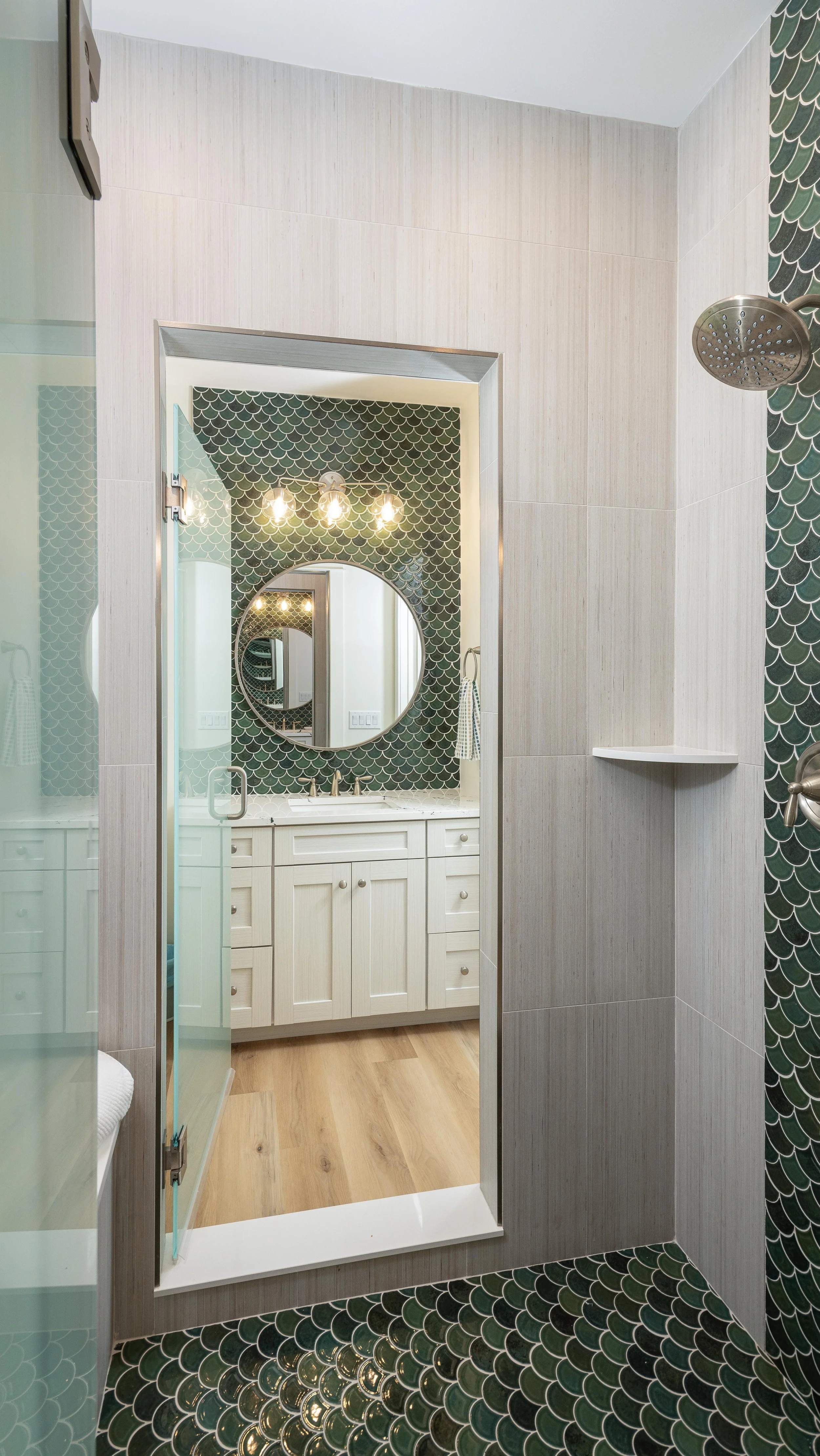 Welcome to the first town in the first state! Strolling thru downtown Lewes, DE you’ll find a little slice of “paradiso”. In designing this whimsical eatery, my inspiration came from artworks by the talented JANET HILL. I then re-worked the juice/prep bar for a more functional workspace and added storage with built in bench seating. Diagonally laid luxury LVT floor, tropical wall tiles and commercial vinyl wallpaper provided texture & durability to this space. I also added a slew of recessed lighting and gorgeous new basket chandeliers to the dining room. Both bathrooms received a facelift of botanical bliss, zellige tiles and champagne fixtures!
